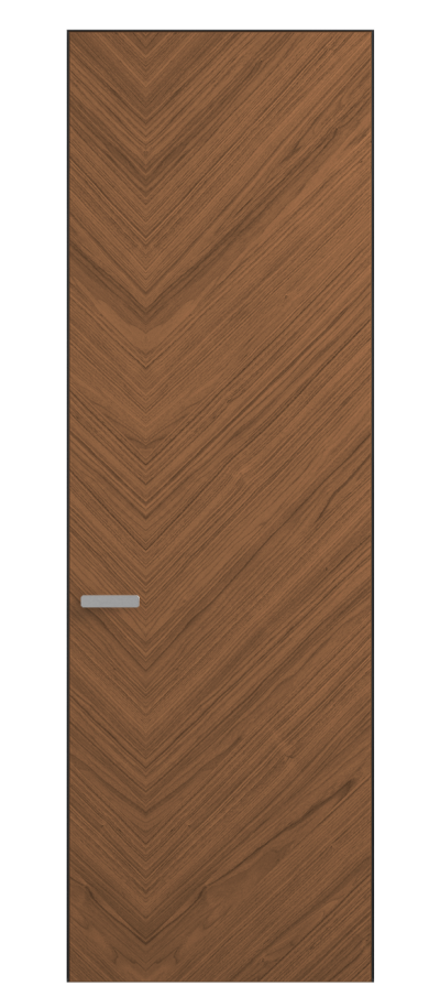 Полотно Rift в скрытом алюминиевом коробе становится полноценным элементом декора. В коллекции представлено 9 моделей дверей в высоте до 3 метров. Рисунок раскладки шпона варьируется от простого до сложного. «Рубашка» для каждого полотна подбирается вручную по цвету, текстуре и фактуре.