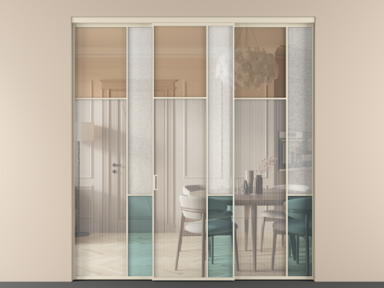 Дополнительно на раздвижную двустворчатую перегородку вдоль стены и четырехстворчатую перегородку внутри проема с двумя неподвижным полотнами можно установить механизм синхронного открывания — при открывании одной створки, вторая открывается автоматически.