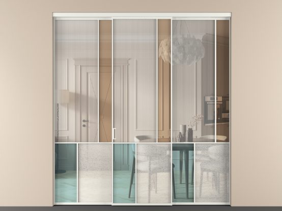 Дополнительно на раздвижную двустворчатую перегородку вдоль стены и четырехстворчатую перегородку внутри проема с двумя неподвижным полотнами можно установить механизм синхронного открывания — при открывании одной створки, вторая открывается автоматически.