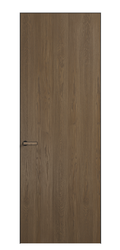 Это полотна с рельефной фрезеровкой. Этот прием делает интерьер объемным, тактильным, вносит интересную текстуру и создает современный образ. Волнистый рельеф может быть выполнен по ламелям из массива дуба в древесных матовых отделках, либо исполнен по натуральному и экологически безопасному материалу — ХДФ, покрытому гладкой эмалью актуальных оттенков.